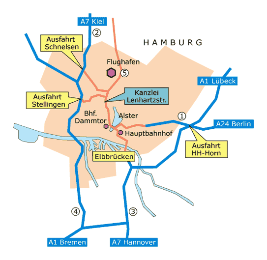 Autobahnausfahrt Hamburg-Horn - 2. rechts abbiegen in Sievekingsallee - geradeaus Bürgerweide - an großer Kreuzung rechts abbiegen in Wallstraße - geradeaus Sechslingspforte - hinter Schwimmhalle links abbiegen in An der Alster - Rechtsknick am Ende der Binnenalster auf Kennedybrücke - geradeaus Alsterglacis -- halbrechts in Rothenbaumchaussee (hinter Moorweide/Shell-Tankstelle) - geradeaus bis Klosterstern - 4. rechts abbiegen von Kreisverkehr in Eppendorfer Baum - geradeaus in Lenhartzstraße - vor Parkbuchten links und rechts das letzte Haus auf der linken Seite.